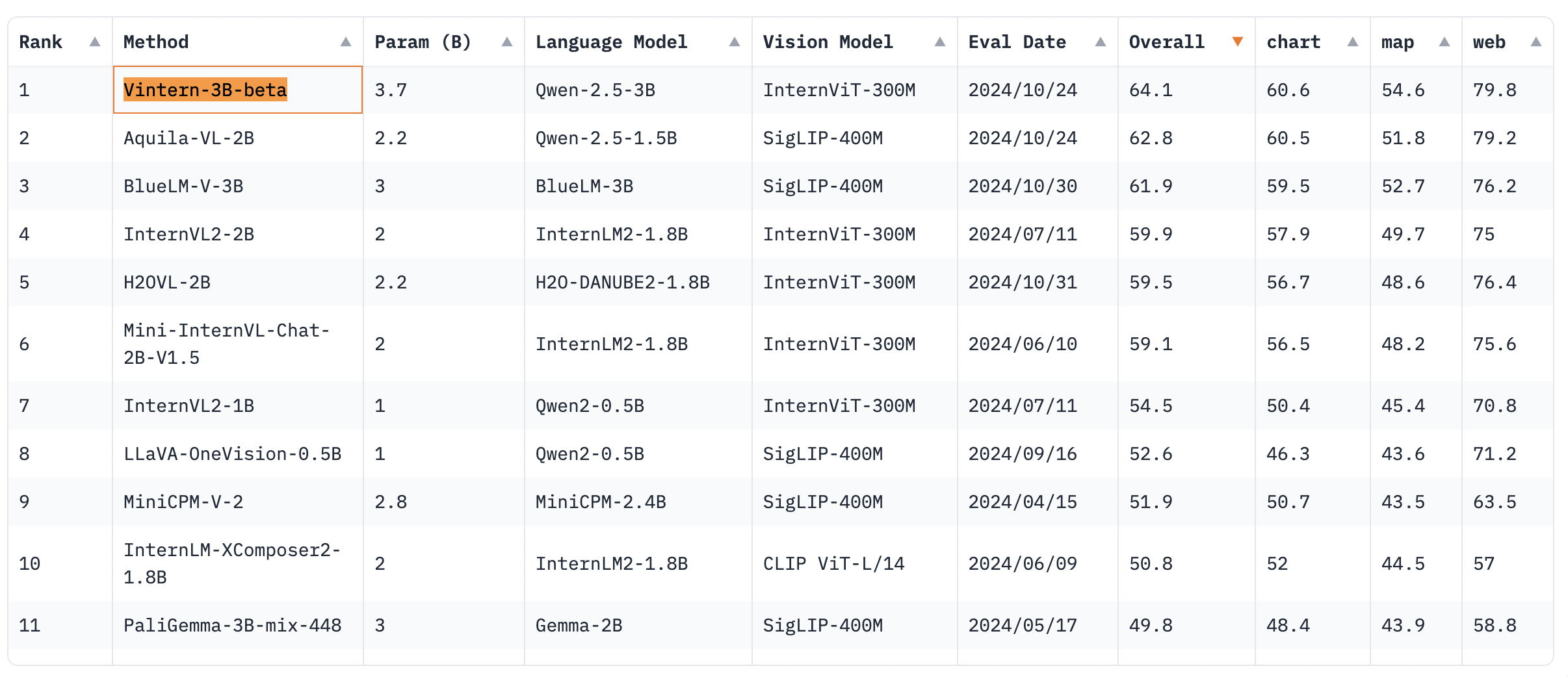 | Rank | Method | Param (B) | Language Model | Vision Model | VI |