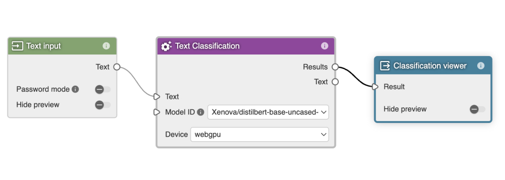 Client nodes are nodes running tranformers pipelines on the client side using Transformers.js. All Client nodes have WASM and WebGPU (experimental) backend support, and you can find web-compatible models by visiting https://huggingface.co/models?library=transformers.js.
